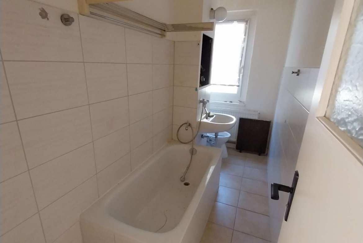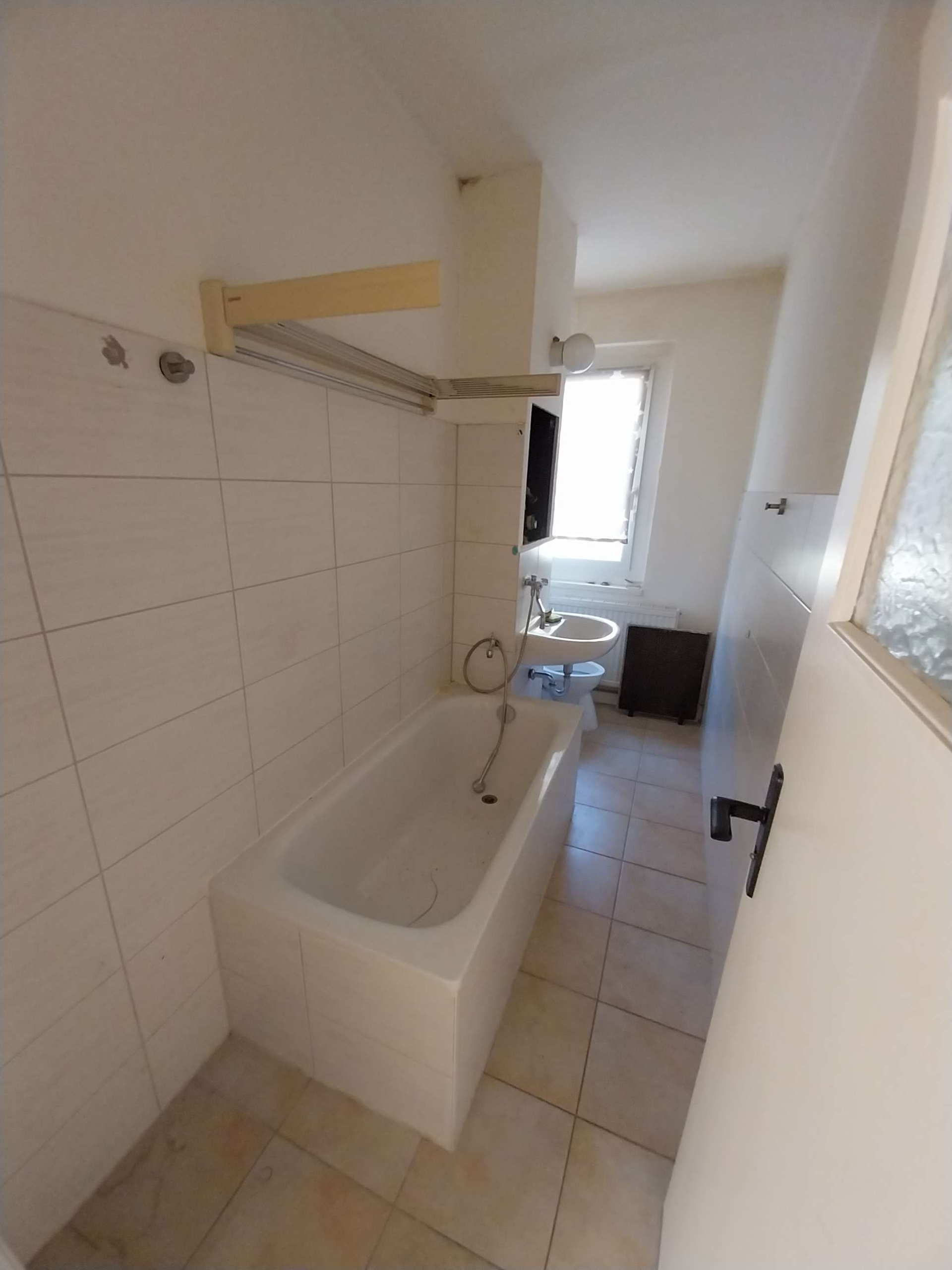 Das Bad ist mit einer Badewanne ausgestattet. Die Versorgung mit Warmwasser und Heizung erfolgt zentral.