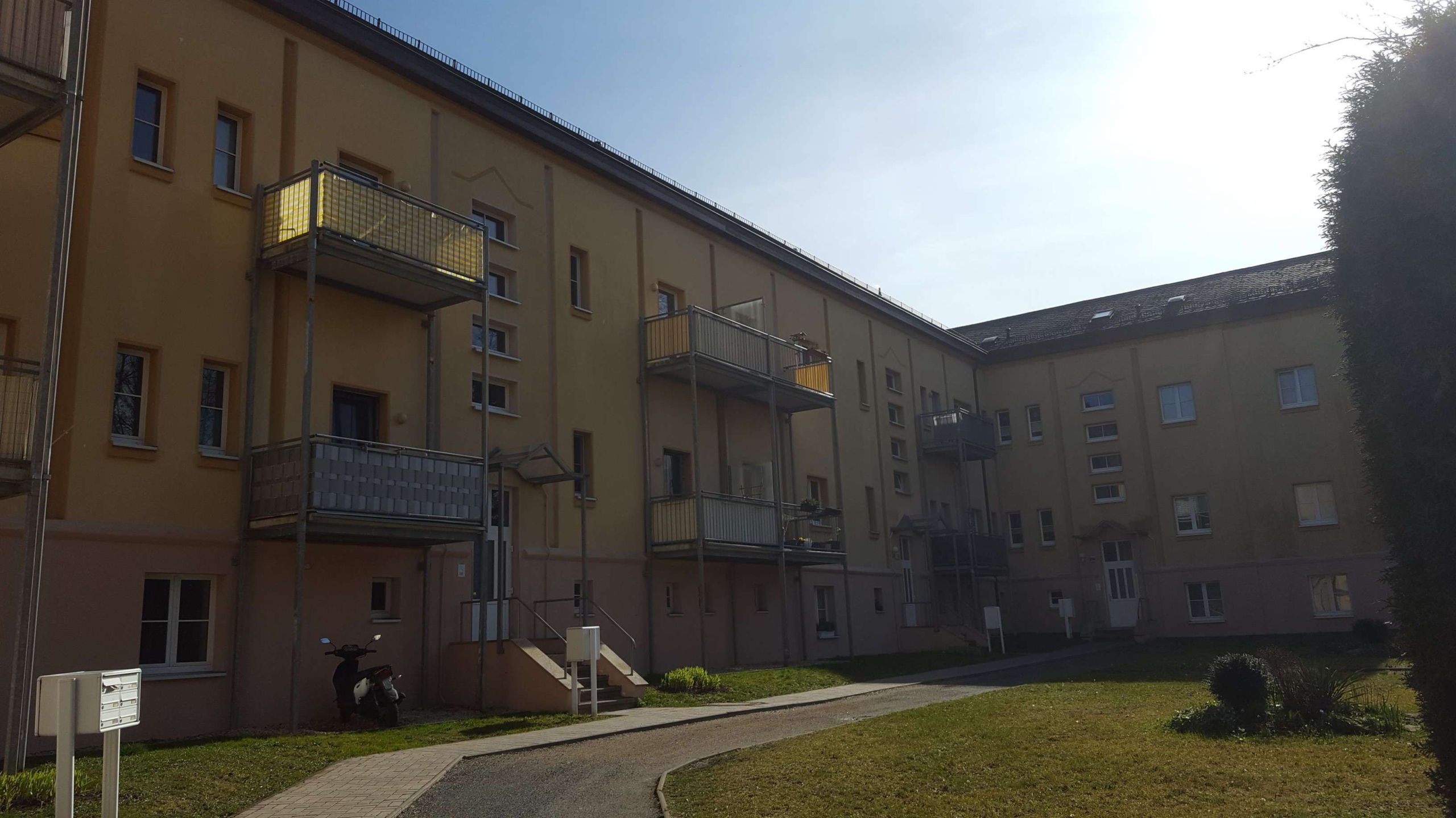 Es handelt sich um ein Mehrfamilienreiheneckhaus 3 Etagen. Alle Wohnungen besitzen Balkone. Parkmöglichkeiten bieten die Nebenstraßen in der Umgebung sowie kann ein Stellplatz innerhalb des Grundstückes für 20,00 € im Monat angemietet werden. Das Haus wurde 1999 umfassend saniert. Zum Grundstück gehört eine Grünanlage mit Wäscheplatz und Sitzmöglichkeiten für die Mieter.