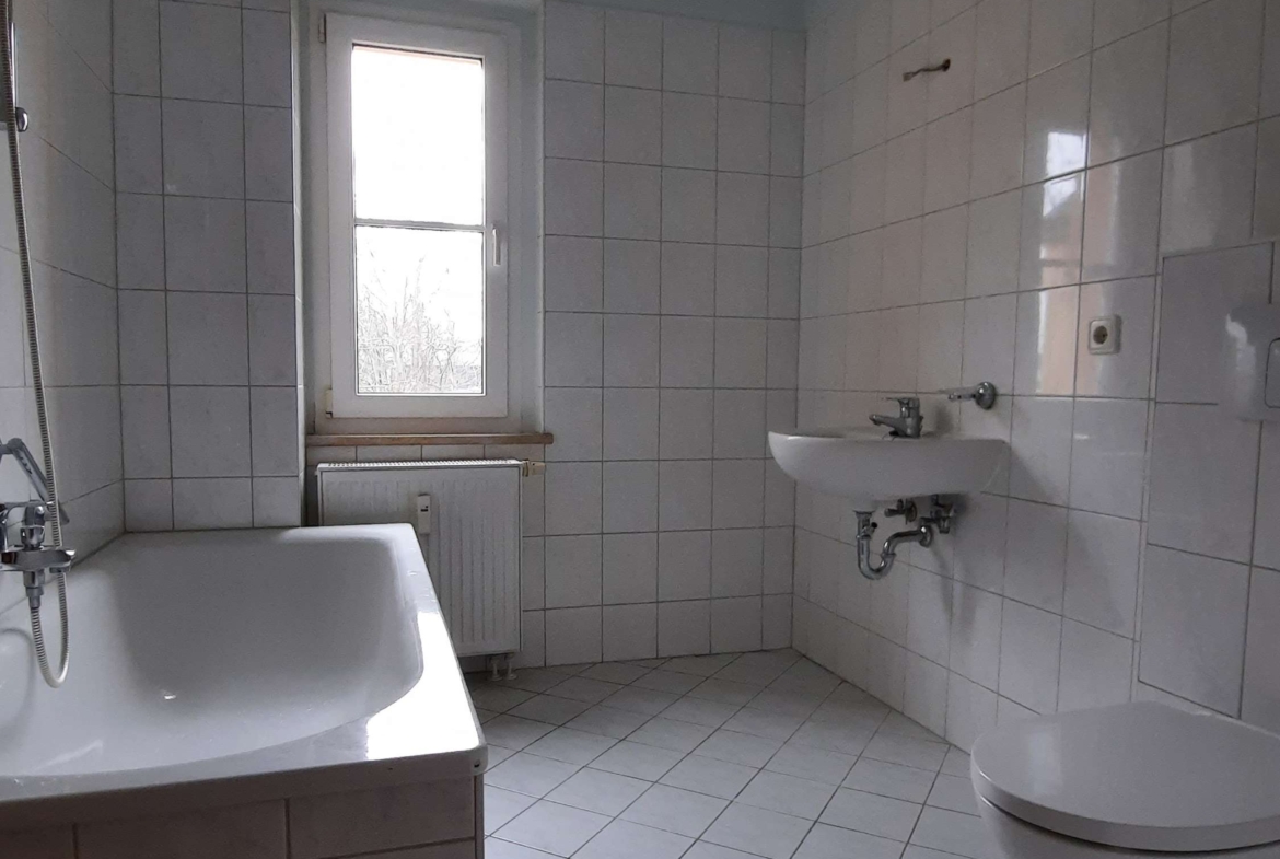 – Bad gefliest mit Badewanne und Fenster