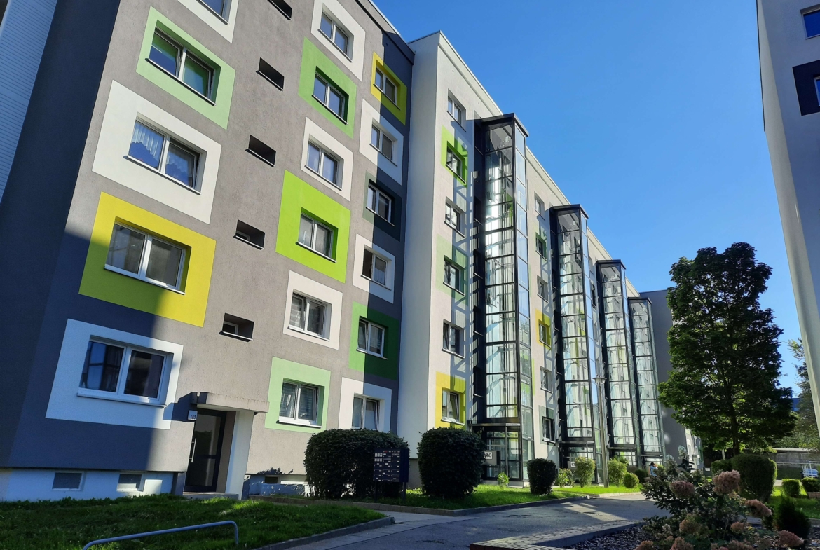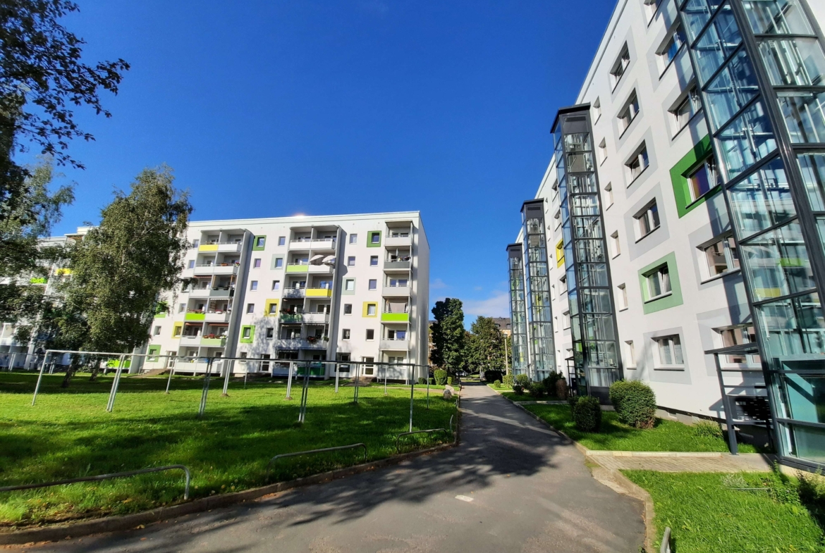 Die Wohnanlage besteht aus 2 Mehrfamilienhäusern mit insgesamt 160 Wohnungen. Diese wurden im Jahre 2015 bis 2016 hochwertig saniert. In beiden Objekten befinden sich zum größten Teil 1 – 4 Zimmerwohnungen von 34 bis 68 qm. Der Zugang zu den Wohnungen erfolgt entweder über das Treppenhaus oder den Panoramafahrstuhl. Der überwiegende Teil der Wohnungen verfügt über einen Balkon.