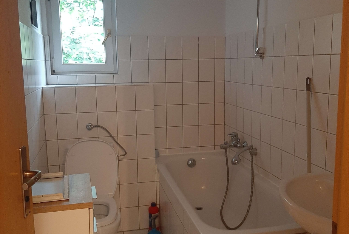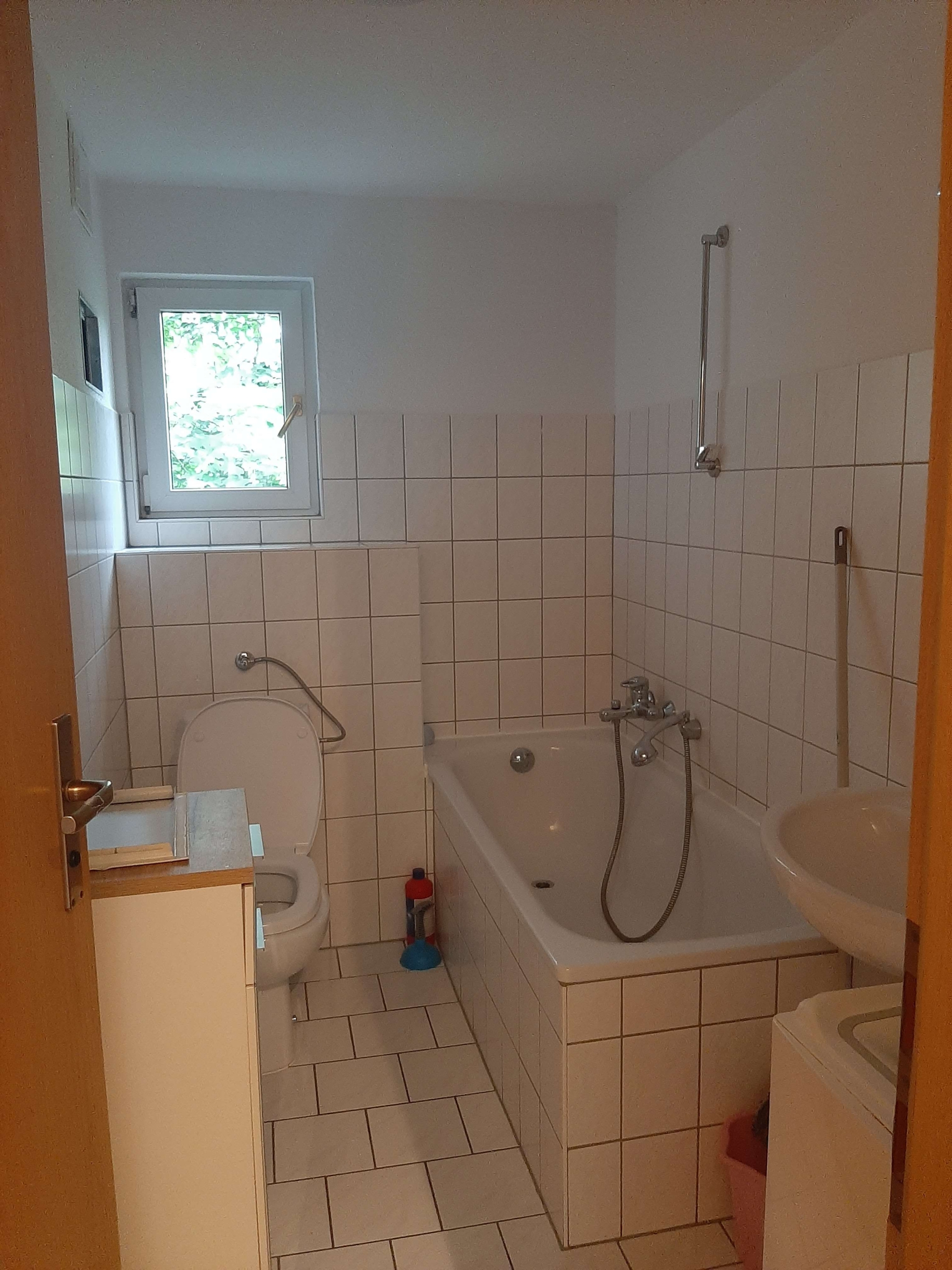 – Badezimmer mit Fenster, Badewanne und Waschmaschinenanschluss