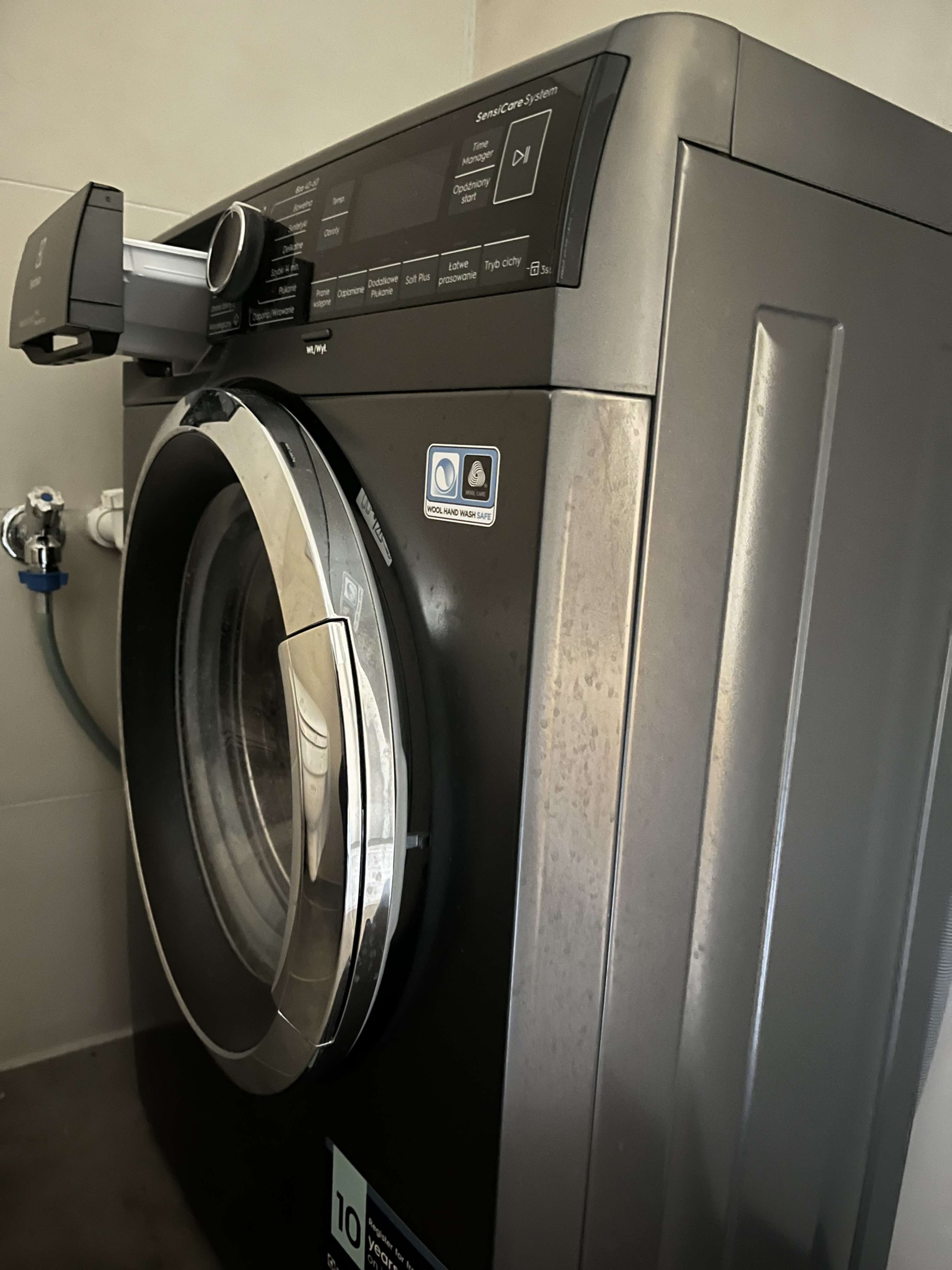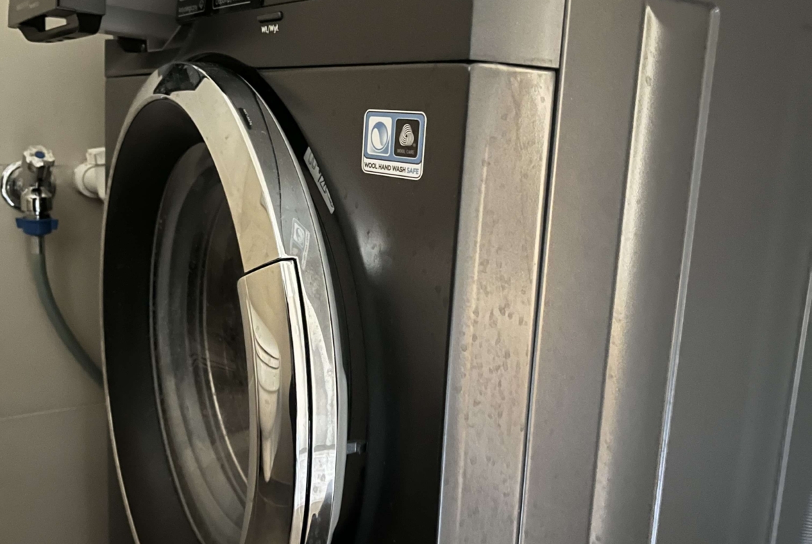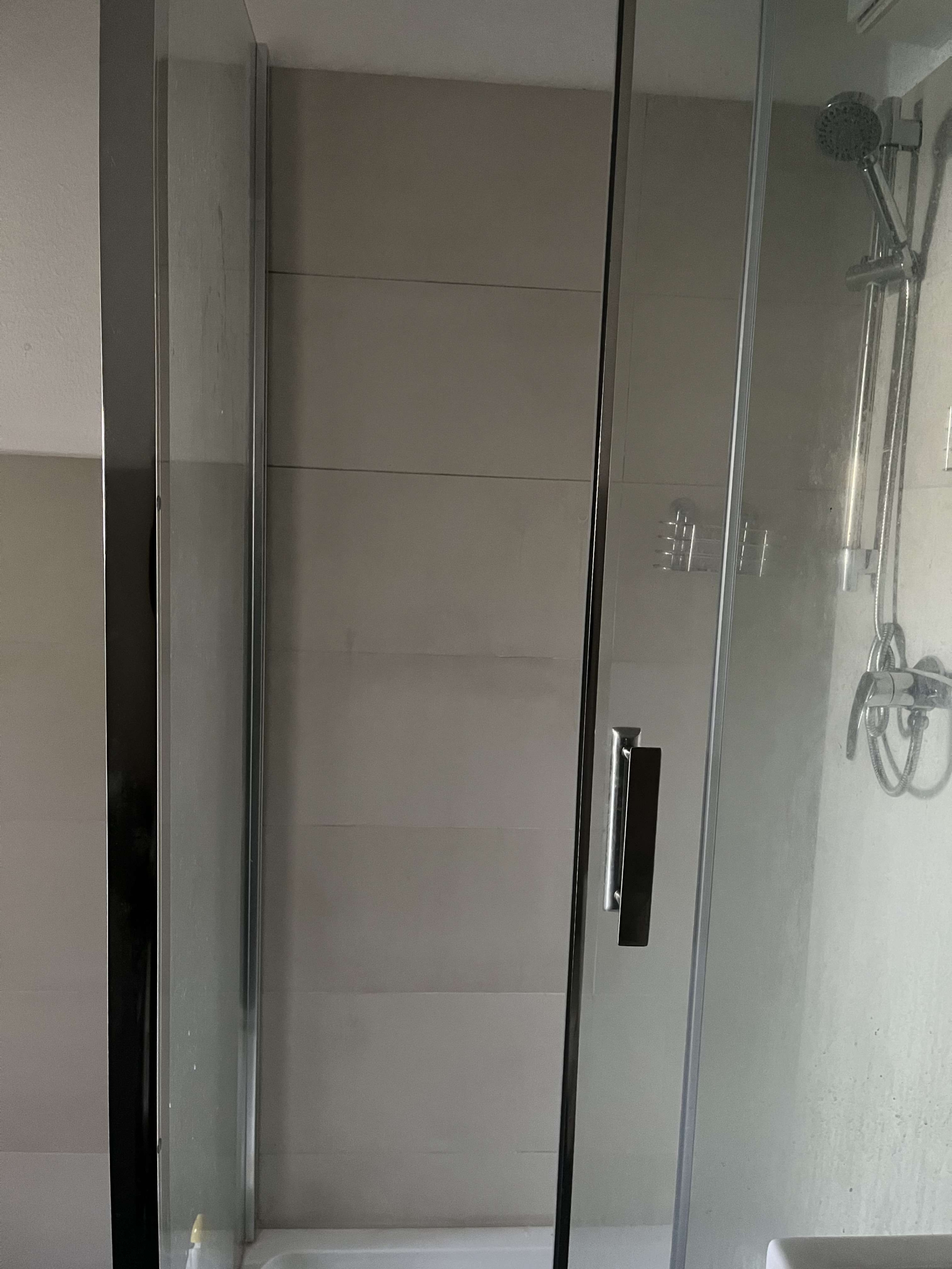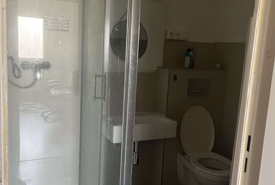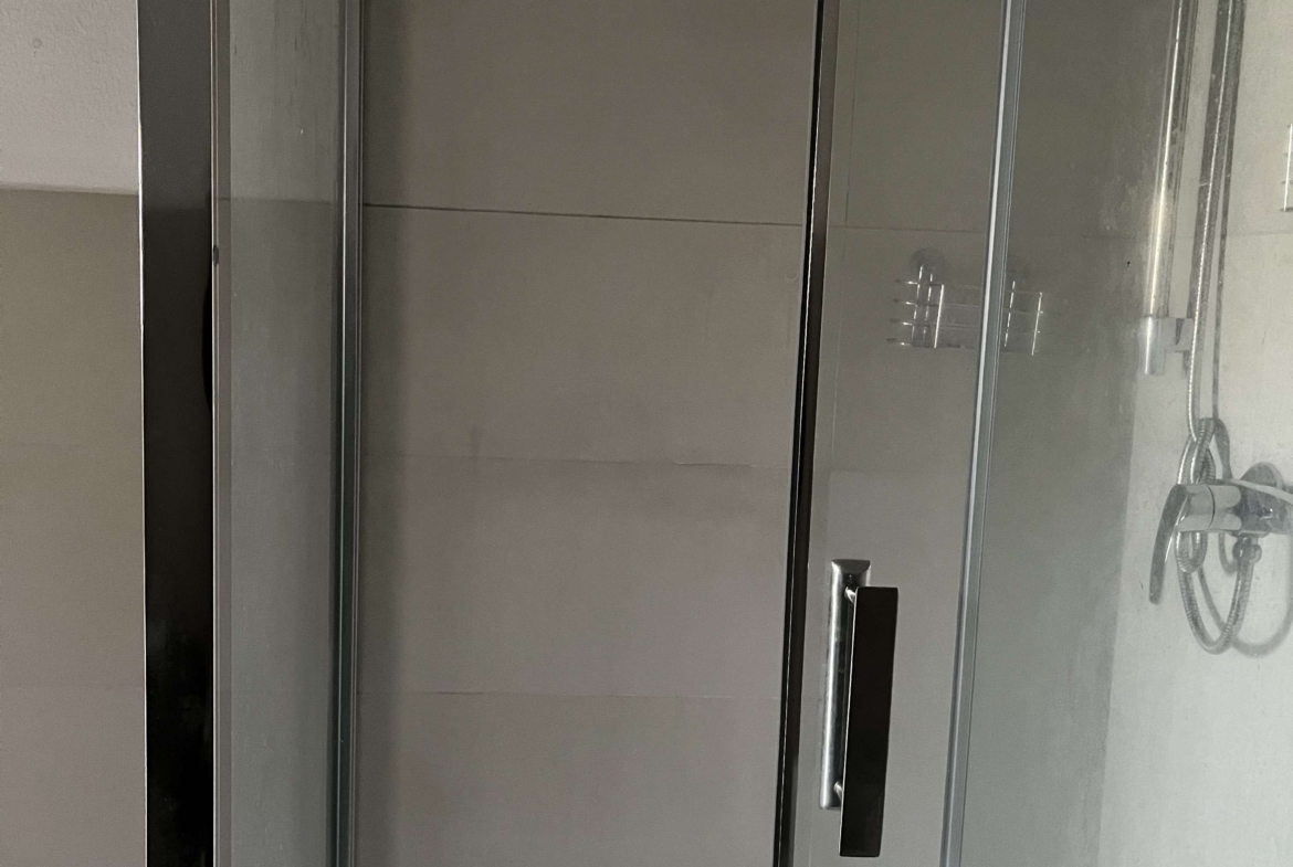 – **Modernes Badezimmer: ** Stilvolles Design mit Dusche und Waschmaschine.
